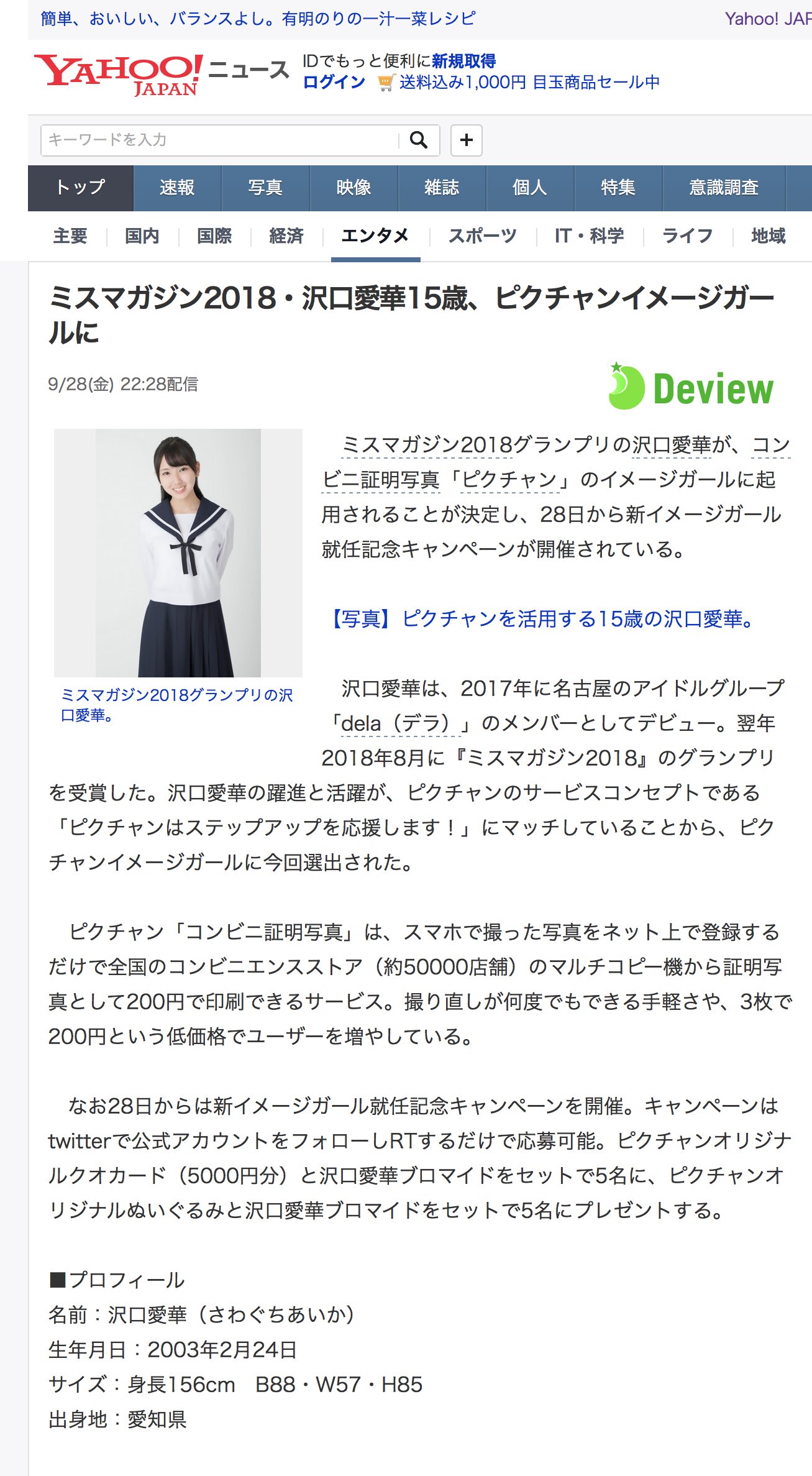 Yahoo!ニュースをはじめ各インターネット媒体で「ミスマガジン2018・沢口愛華15歳、ピクチャンイメージガールに」が掲載されました。
